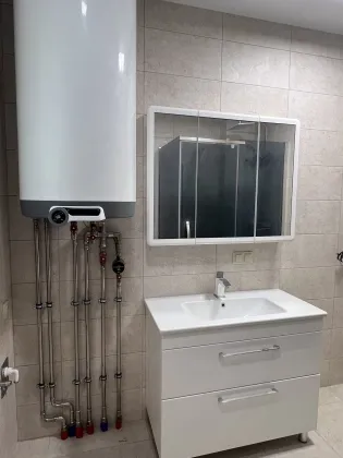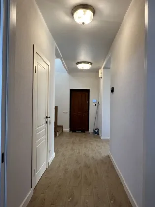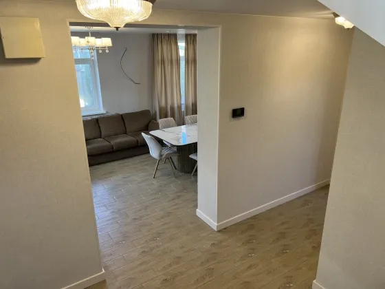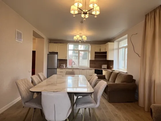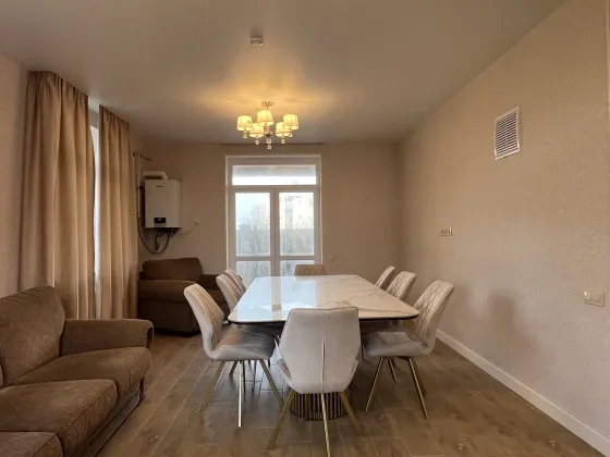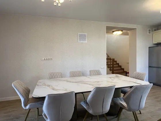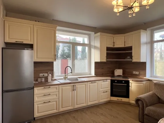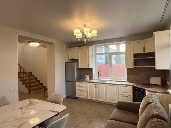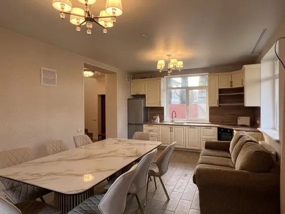 Общая площадь 150 м2, жилая 85 м2. На первом этаже большая кухня-столовая 29 м2 с выходом на летнею террасу и жилая спальная комната 14,2 м2. В кухне установлена кухонная мебель, двухконтурный газовый котел. Санузел на первом этаже совмещенный 6 м2, сделана душевая, установлен бойлер косвенного нагрева от газового котла. По всему этажу разведены теплые полы.