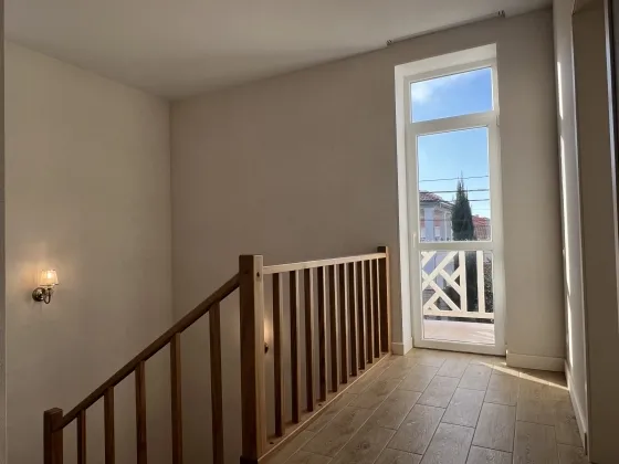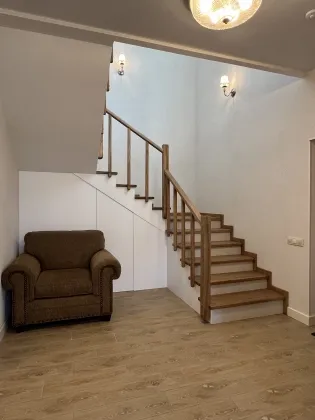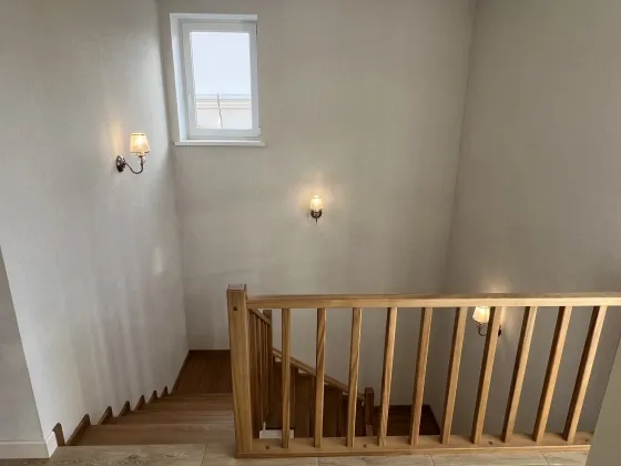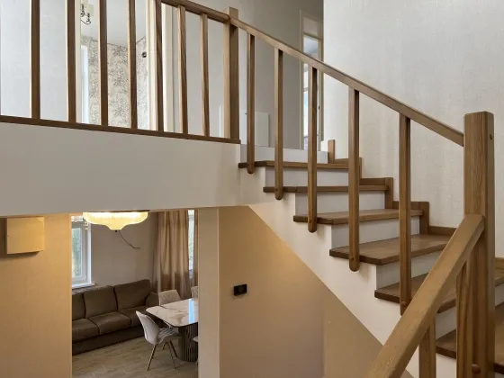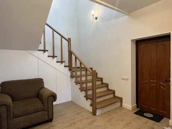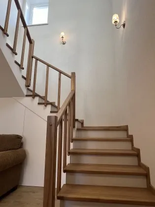 Лестница на второй этаж бетонная, отделана деревянными ступенями.