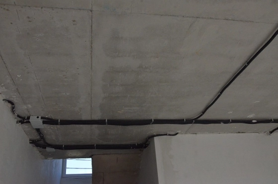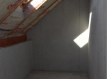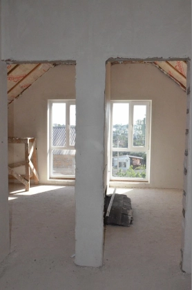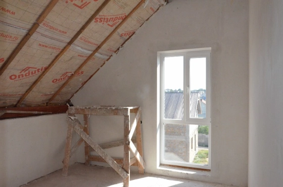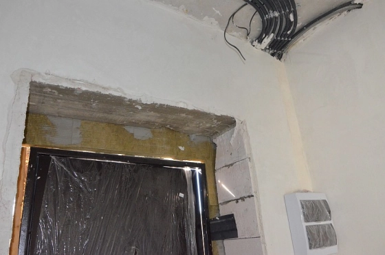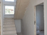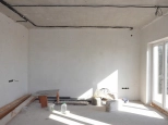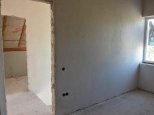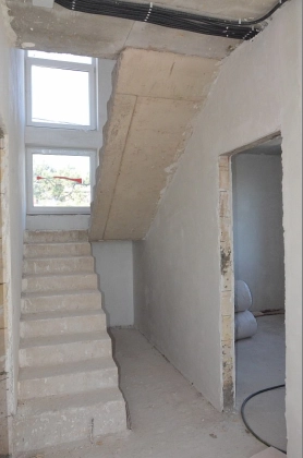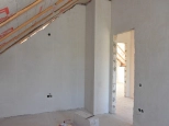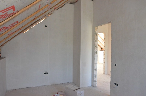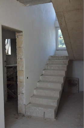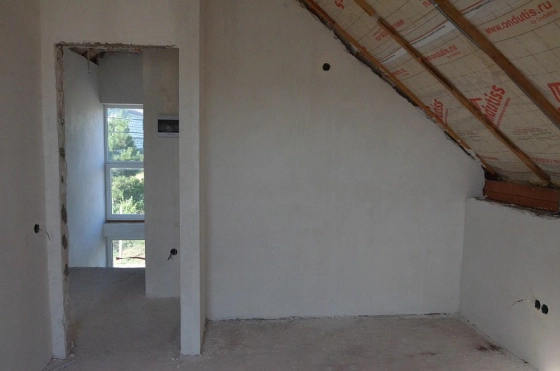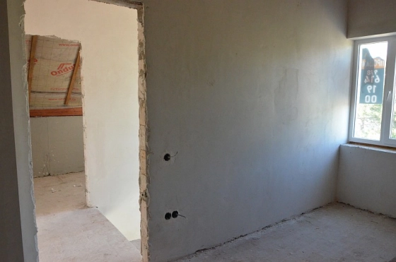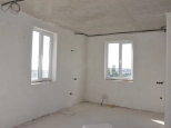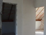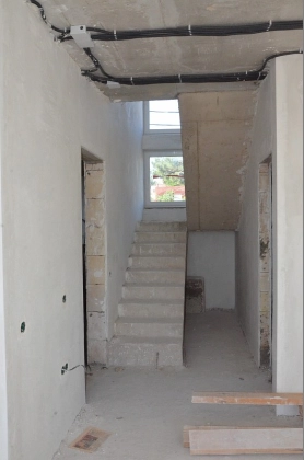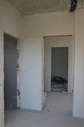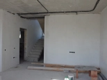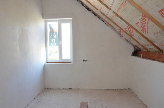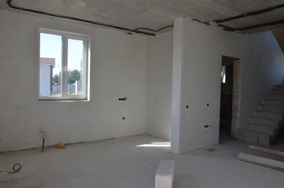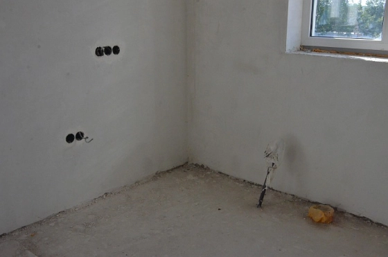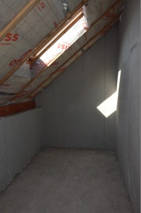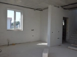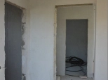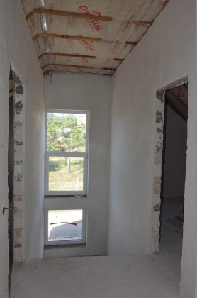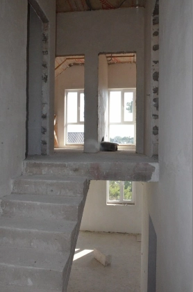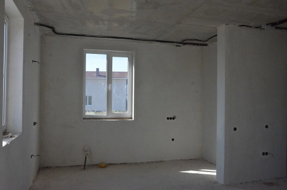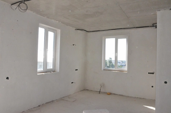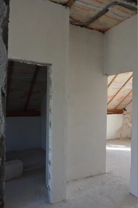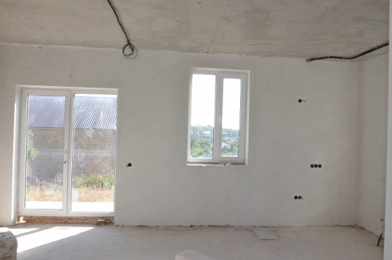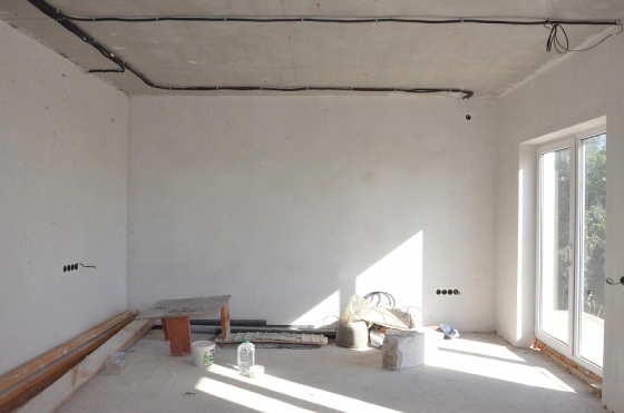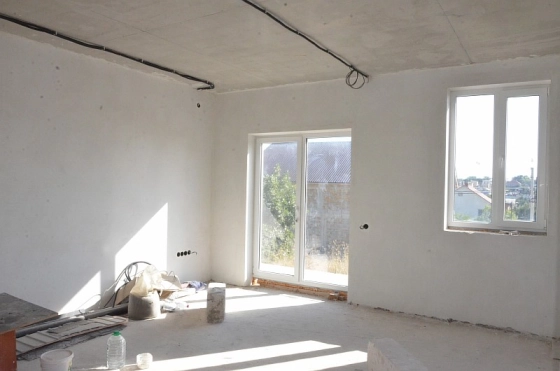 Стены наружные 300 мм + утепление 50 мм (наружные стены 350 мм с учетом утепления) и внутренние выполнены из мелкоштучного газобетонного камня. Внутри дома разведена электропроводка, выполнена штукатурка стен.