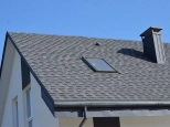 Кровля двухскатная, утепленная, выполнена из современной битумной черепицы в сером графите (смотрится красиво и современно, в цвет с серыми элементами фасада), установлена крышная водосливная система. (При строительстве делали фото-видео фиксация всех этапов строительства дома и материалов, так что сможем подтвердить свои слова будущему хозяину).