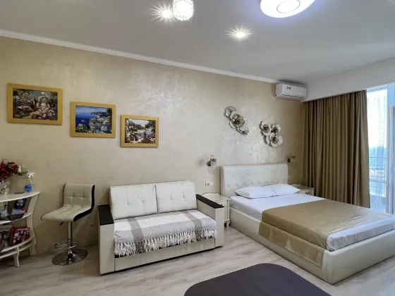 Между комнатой и лоджией установлено большое, панорамное остекление. На окнах повешены легкая тюль и шторы блэкаут, которые способствуют хорошему затемнению комнаты в дневное время. С балкона открывается очень красивый вид на море! Лоджия очень просторная, что способствует комфортному отдыху на свежем воздухе и наслаждением видом на море или закатом солнышка вечером.