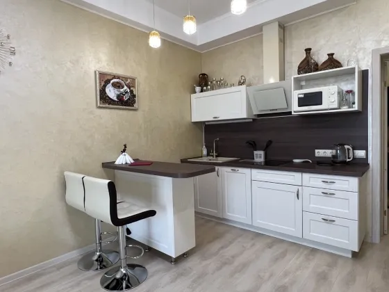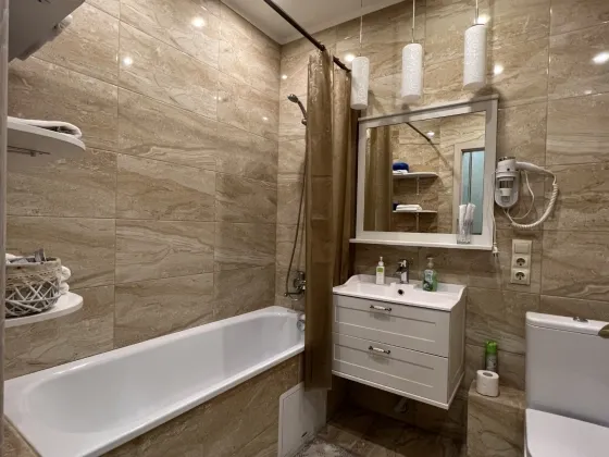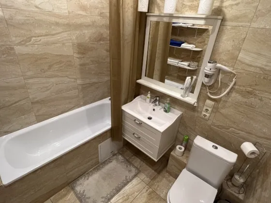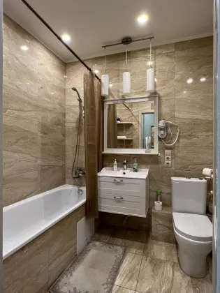 В квартире постоянное горячее водоснабжение, центральное отопление; интернет, телевидение. Апартамент полностью укомплектованы «под ключ» для постоянного проживания, или под сдачу в аренду!