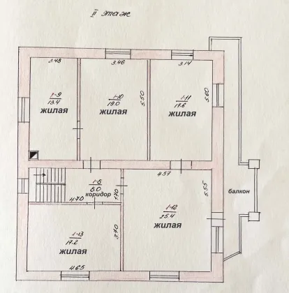 На втором этаже расположены 5 жилых комнат: отдельная комната 17,2 м2; проходная комната 25,4 м2; отдельная спальня 17,6 м2; проходная комната 19, м2; отдельная комната 13,4 м2.