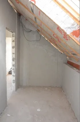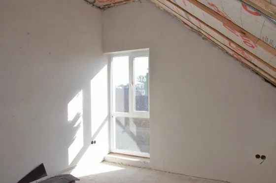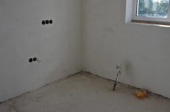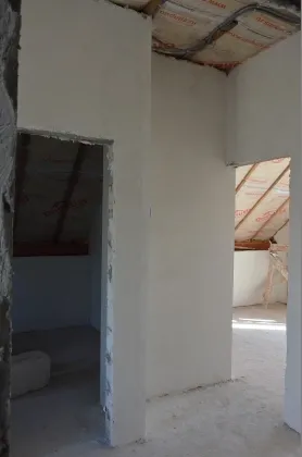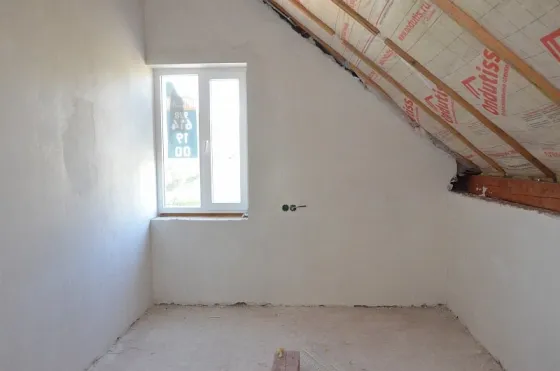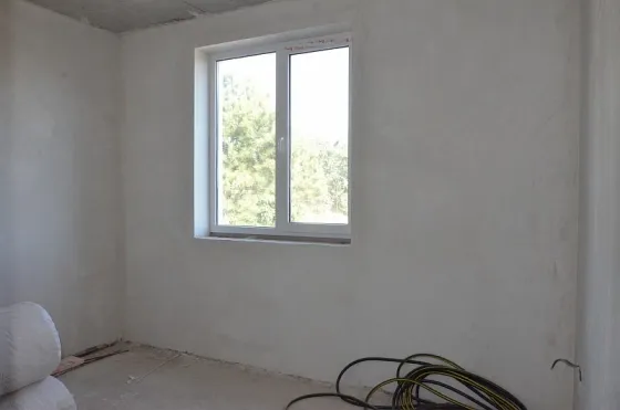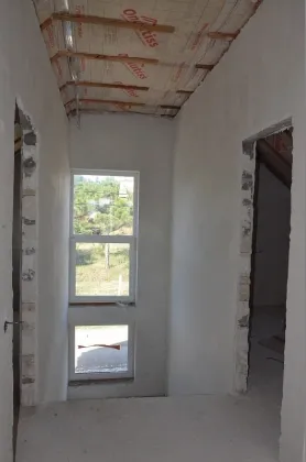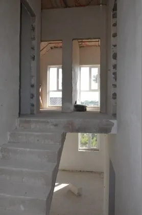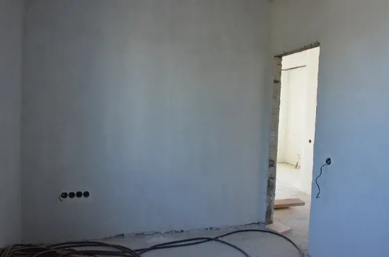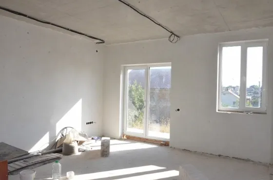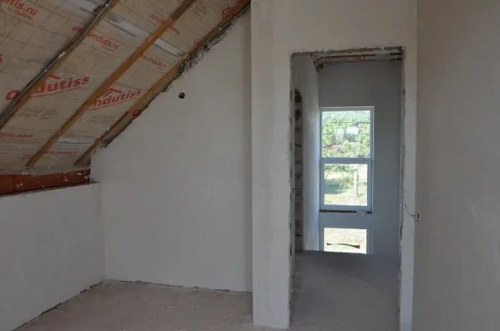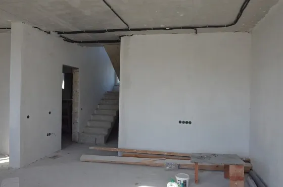 Стены наружные 300 мм + утепление 50 мм (наружные стены 350 мм с учетом утепления) и внутренние выполнены из мелкоштучного газобетонного камня. Внутри дома разведена электропроводка, выполнена штукатурка стен.