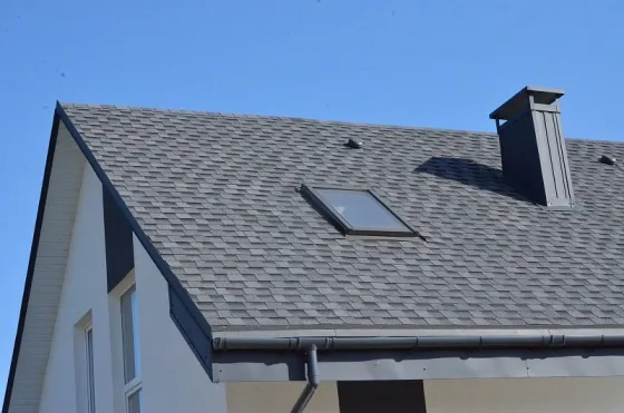 Кровля двухскатная, утепленная, выполнена из современной битумной черепицы в сером графите (смотрится красиво и современно, в цвет с серыми элементами фасада), установлена крышная водосливная система. (При строительстве делали фото-видео фиксация всех этапов строительства дома и материалов, так что сможем подтвердить свои слова будущему хозяину).