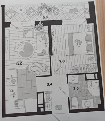 Планировка квартира компактная: кухня-гостиная 14 м2, изолированная спальня 10 м2, современный совмещенный санузел 3,6 м2 с ванной.