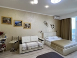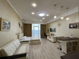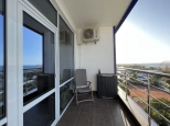 Между комнатой и лоджией установлено большое, панорамное остекление. На окнах повешены легкая тюль и шторы блэкаут, которые способствуют хорошему затемнению комнаты в дневное время. С балкона открывается очень красивый вид на море! Лоджия очень просторная, что способствует комфортному отдыху на свежем воздухе и наслаждением видом на море или закатом солнышка вечером.