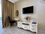 В спальной зоне установлена большая, шикарная двухспальная кровать с мягким подголовников, с прикроватными тумбочками и светильниками «бра»; установлен кондиционер. На против кровати установлен большой плазменный телевизор, туалетный столик с большим зеркалом.