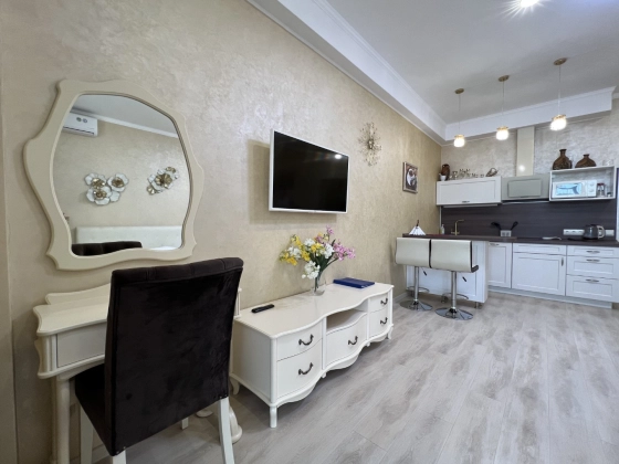 Общая площадь Апартаментов по документам 35 м2 + большая лоджия еще 6 м2. В апартаменте выполнен свежий дизайнерский ремонт в светлых тонах, применялись дорогие и качественные материалы, техника и сантехника. Состояние квартиры идеальное: все чистое и ухоженное!