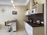 Жилая комната разделена на спальную зону и зону кухни. В кухонной зоне имеется встроенная кухонная мебель и бытовая техника: электрическая плита, вытяжка, посудомойка, фильтр на питьевую воду, чайник, микроволновка. Для удобства приема пищи, сделана барная стойка со встроенными тумбочками и полками для кухонной утвари.