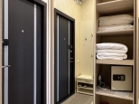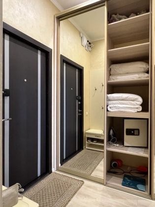 В прихожей установлен огромный встроенный шкаф-купе, встроенный холодильник, сейф, белье, хозяйственный инвентарь.