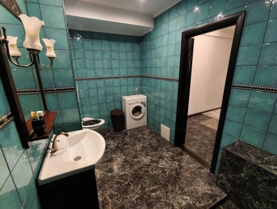 В первой спальной установлена вся спальная мебель и шкафы с подсветкой от известного турецкого бренда. Во второй спальне установлена спальная интерьерная мебель от «Интердизайн». Из спальной имеется выход на застекленную лоджию со стеллажами для бытовых нужд. Вся эта мебель остается радовать новых собственников. В спальнях установлены кондиционеры, на полу уложен ламинат.