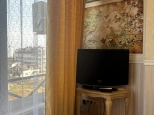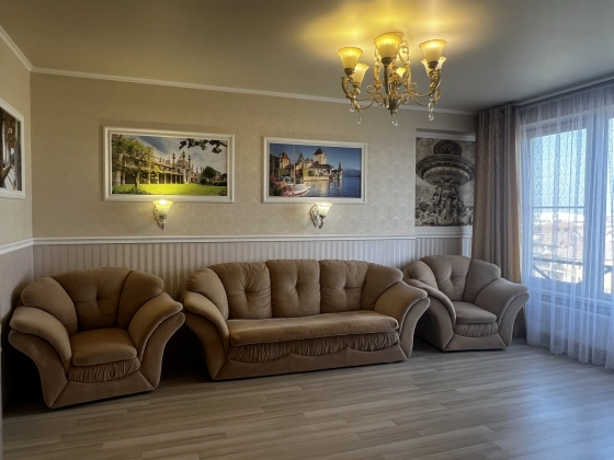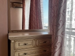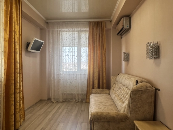 Две спальни полностью раздельные 10,7 м2 и 13,3 м2 со все встроенной мебелью и кондиционерами. Третья комната с большим окном 19 м2 совмещена с кухней, но при этом зонально имеет функцию прихожей комнаты, совмещённую с кухней 10,5 м2; с кухни есть выходом на застекленный балкон. В комнате большой раскладной диван, мягкая мебель, кондиционер, телевизор.
